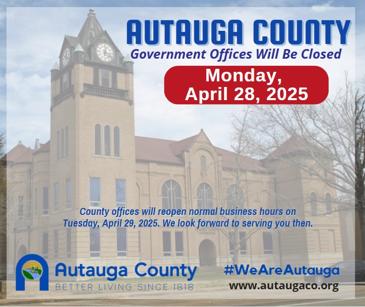 Monday, April 28, 2025 County Offices ClosedAutauga County offices will be closed Monday, April 28. Offices will reopen normal business hours Tuesday, April 29. ![]() |