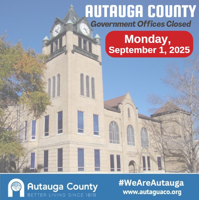 Autauga County government offices will be closed Monday, September 1, 2025 in observance of Labor Day, emergency operations will be fully operational during this time. We hope everyone has a safe and enjoyable Labor Day holiday.
