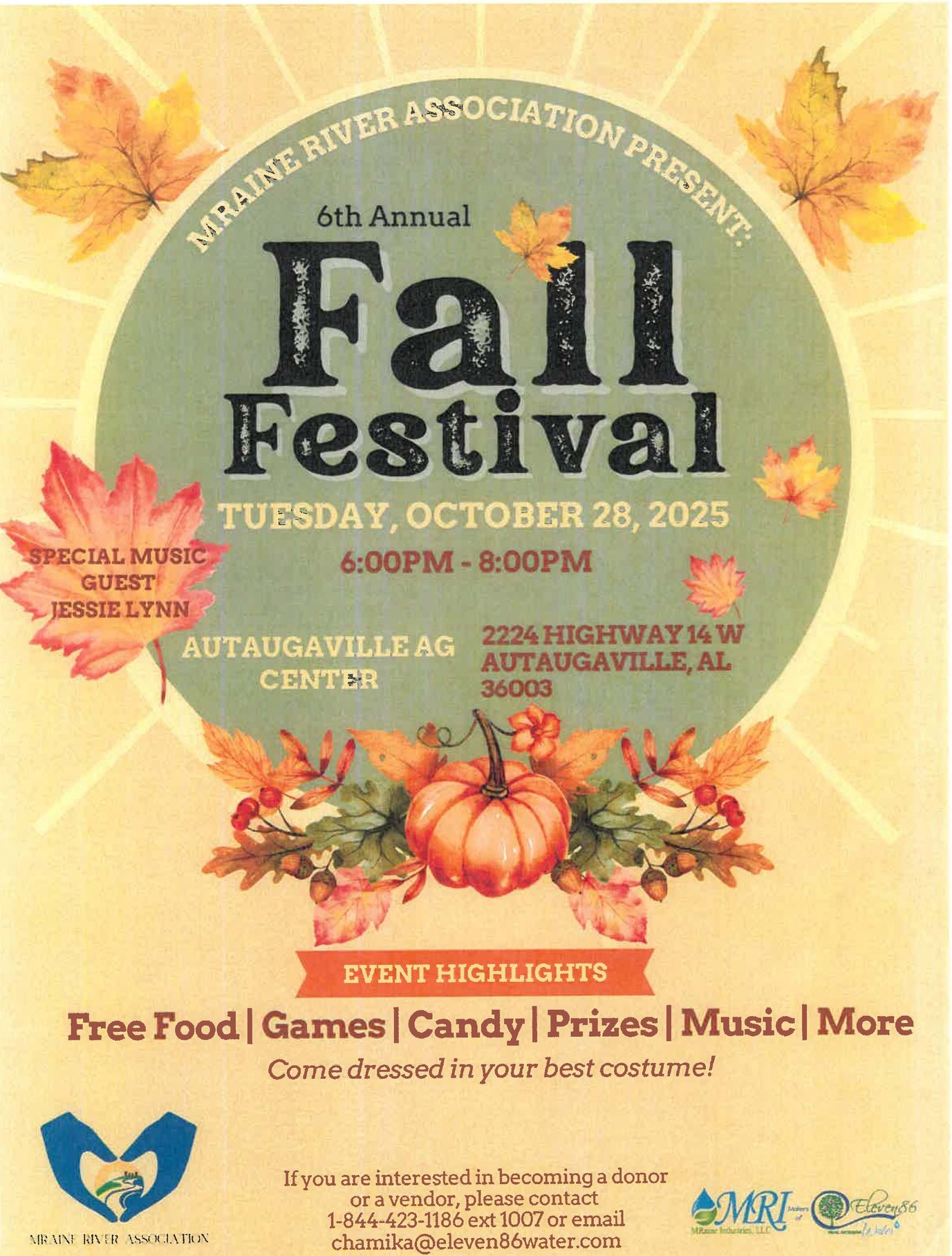 6 PM- 8 PM- 6th Annual Fall Festival hosted by the MRaine River Association and MRaine Industries LLC.Everyone is invited to join MRaine River Association and Eleven86 Water for thekr 6th Annual Fall Festival. This event is free to the public and will be filled with free food, games, prizes, and more! Come join us and make this year the biggest year yet! This is a family-friendly event. ![]() |