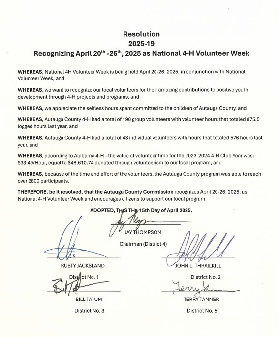 This week, the Autauga County Commission proudly observe National 4-H Volunteer Week from April 20-26, 2025 in Autauga County Alabama. The Autauga County Commission was honored to present Kacey Webb Powell, Autauga County 4-H Extension Agent, and some of her volunteers, with a proclamation recognizing their incredible efforts and hard work. Join us in recognizing the remarkable efforts of the team of volunteers! Last year, 190 volunteers contributed an impressive 875 hours, with 43 individuals contributing a total of 576 hours! Thanks to their hard work and commitment, they have positively impacted over 2,800 youth in our community, inspiring them to find their spark! A heartfelt thank you goes out to the Autauga 4-H Autauga County - Alabama Extension Team under the leadership of Kacey and the amazing volunteers for their dedication to expanding the Autauga County 4-H program, creating invaluable opportunities for our youth! Also, a special thanks to her volunteers that could be in attendance for the presentation of the resolution during the commission meeting. ![]() |