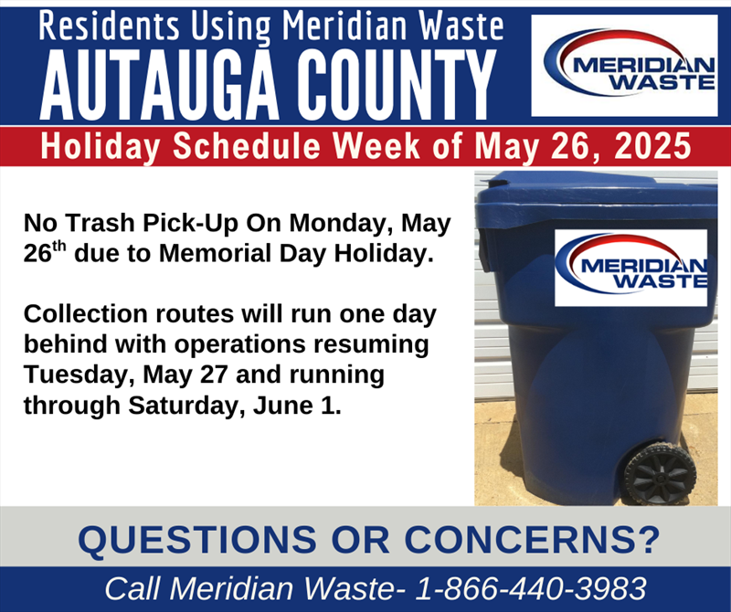 Meridian Waste will not be operating on Monday, May 26, 2025, in observance of Memorial Day. Collection routes will resume on Tuesday, May 27th, with a one day delay ending on Saturday, June 1, 2025. ![]() |