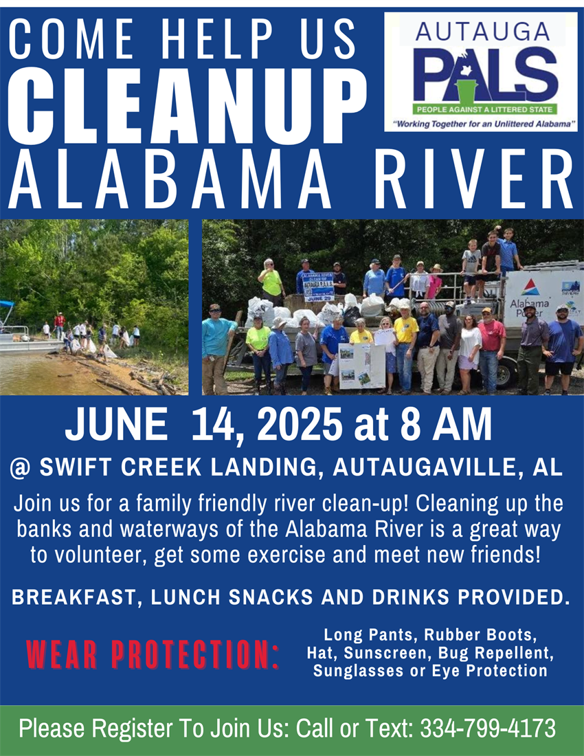 | June 14 at 8 AM: Volunteers Needed for the Alabama River Clean-Up with Autuaga PALS and Partners |