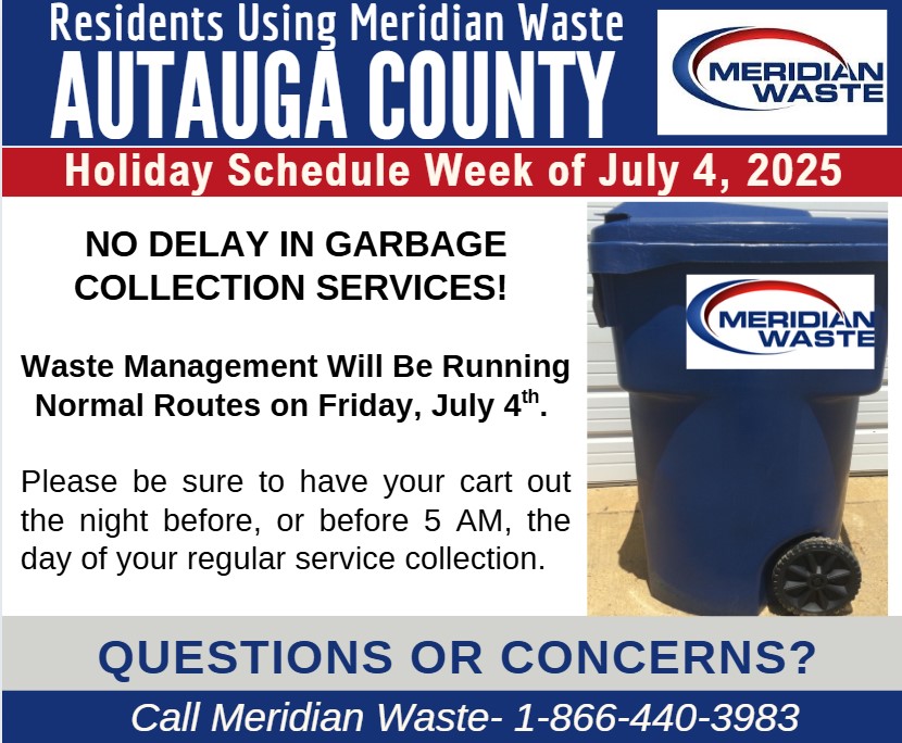 Attention Autauga County Residents: Meridan Waste WILL BERUNNING ROUTES on Friday, July 4th. Please have your trash cart outthe night before or before 5 AM on the date of pick up. Hope everyone has a safe and happy holiday.