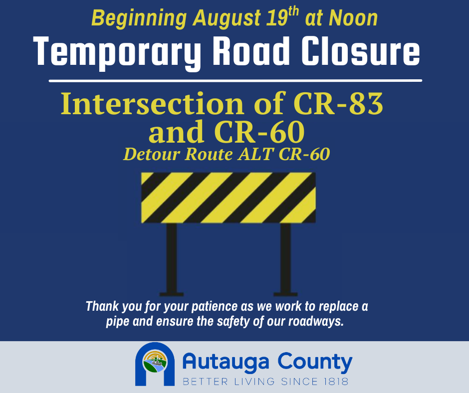 Beginning today, August 19 at noon, the Autauga County Alabama Engineering Department will begin work to replace a pipe at the intersection of CR-83 & CR-60. The road will be closed until further notice, please use the detour route —ALT CR-60. Thank you for your patience, we apologize for the inconvenience as we continue to ensure the safety of our roads. ![]() |