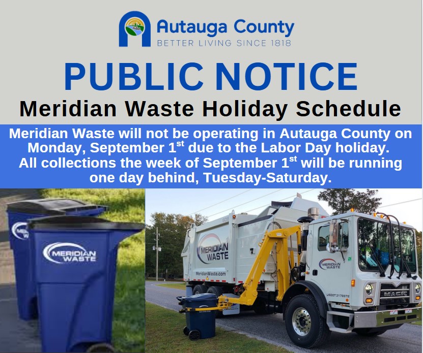 Meridian Waste will not be operating on Monday, September 1st in observance of Labor Day. All waste collections scheduled for the week of September 1st ONLY will be delayed by one day: ![]() |