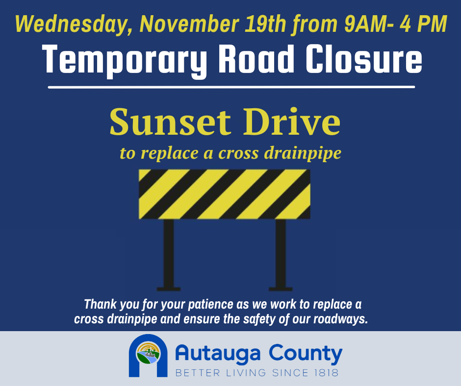 Update: Sunset Drive Has Now Reopened! Please be advised that Suncrest Drive will be closed from 9 AM to 4 PM, Wednesday, November 19, 2025. This closure is necessary to safely complete the replacement of a cross drainpipe. We appreciate your patience and understanding as our Autauga County engineers work to improve our infrastructure. Please plan accordingly and consider alternate routes during these times, if necessary. Thank you for your cooperation! ![]() |